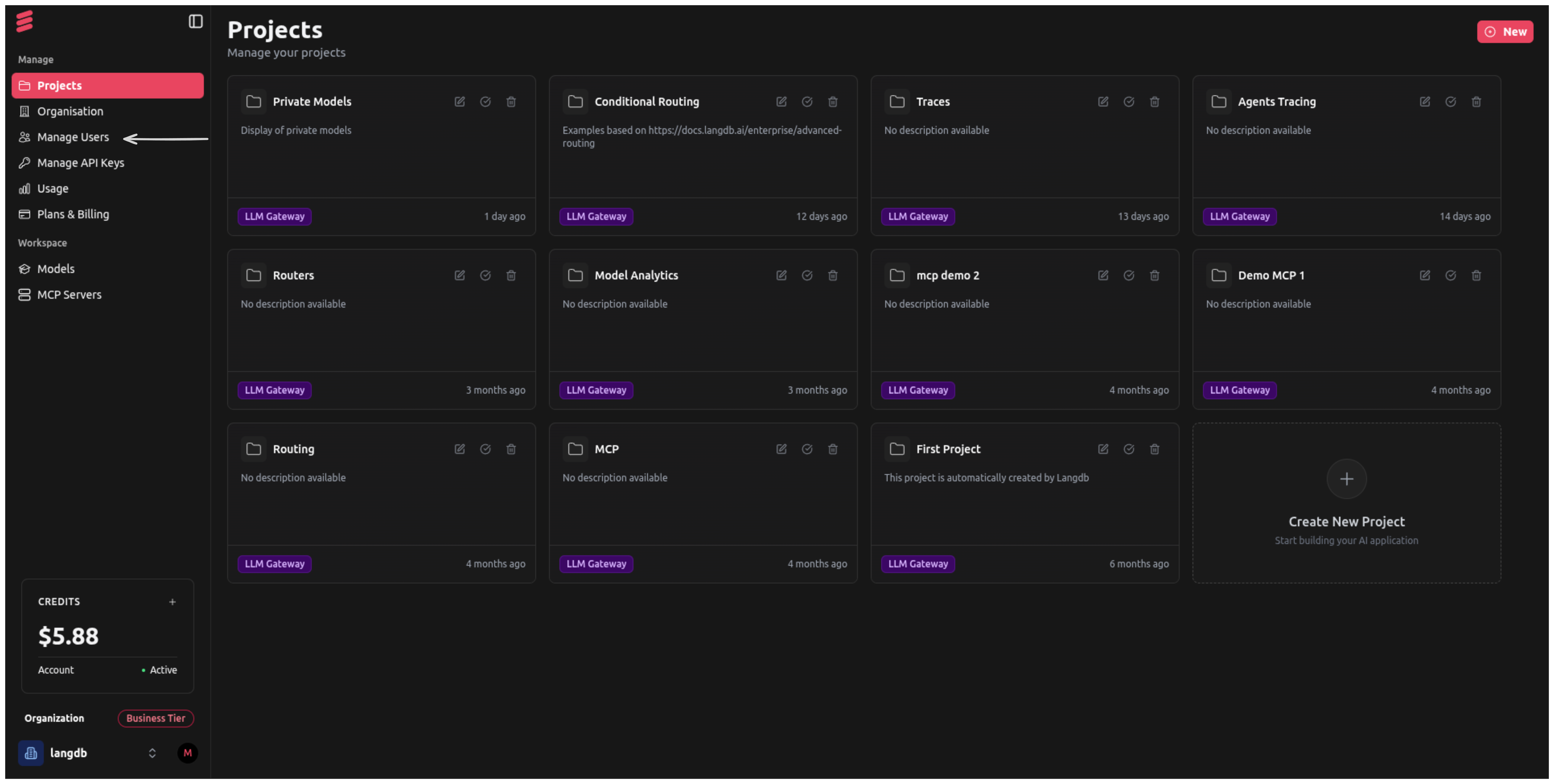 From your LangDB dashboard, click on "Manage Users" in the left sidebar navigation menu.
