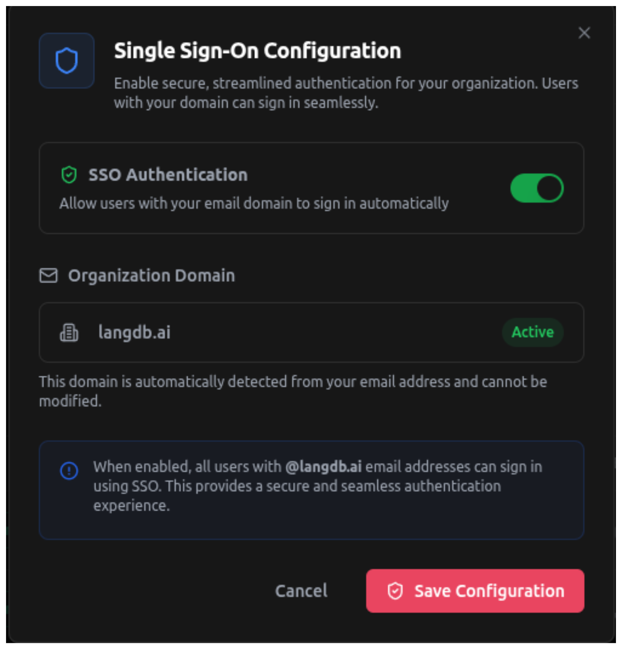 • User Management: All users with your domain will be able to sign in automatically once SSO is enabled.