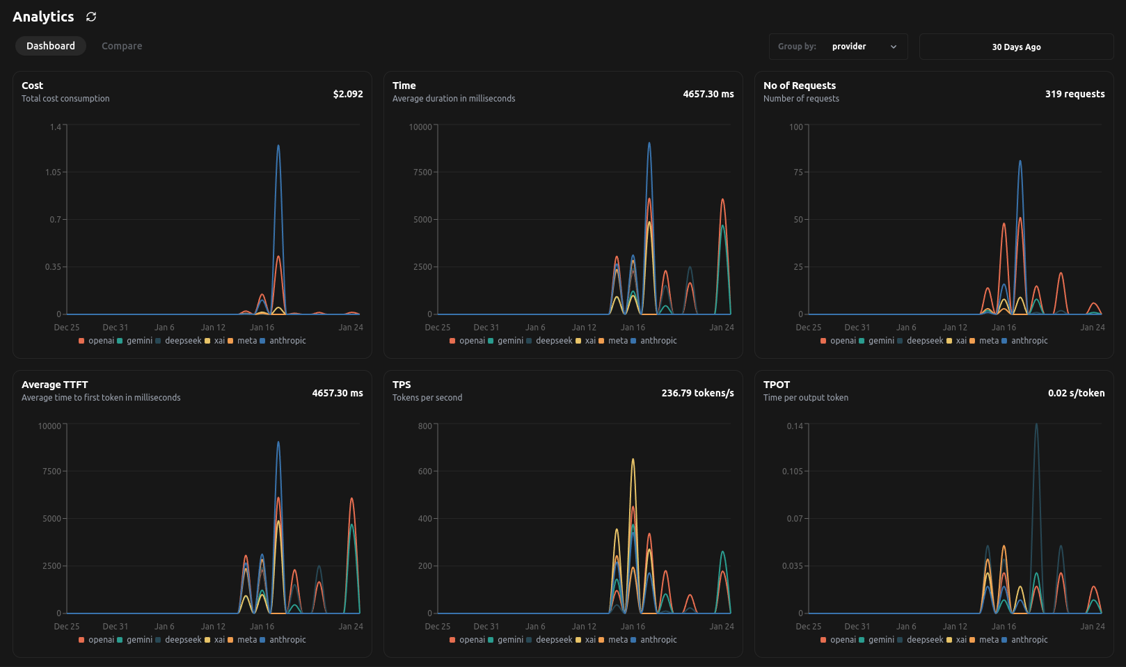 - Enables you to compare costs by provider/model/tags, helping you identify the most cost-effective options for your use cases.