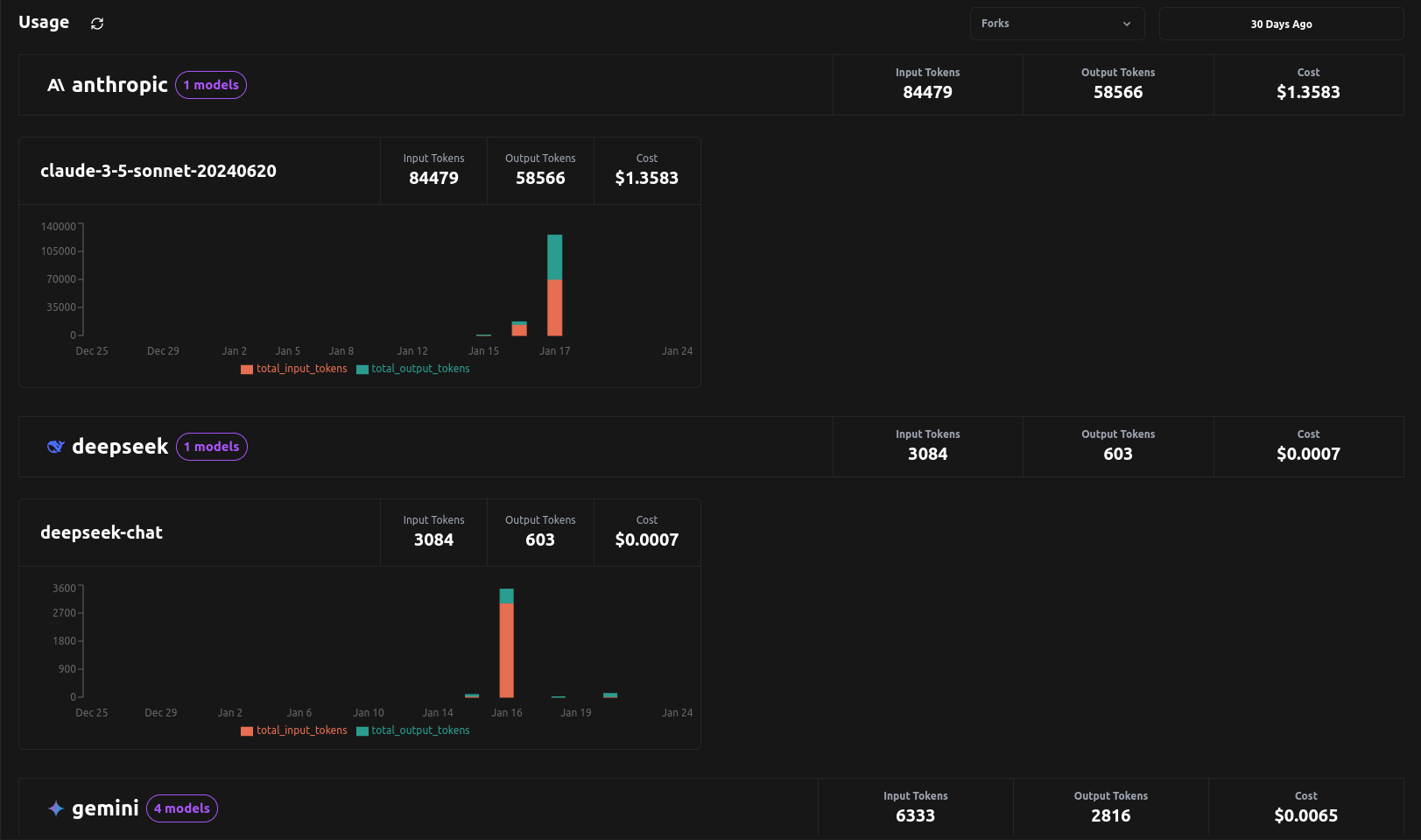 Fetches timeseries usage statistics per model, allowing users to analyze the distribution of LLM usage.