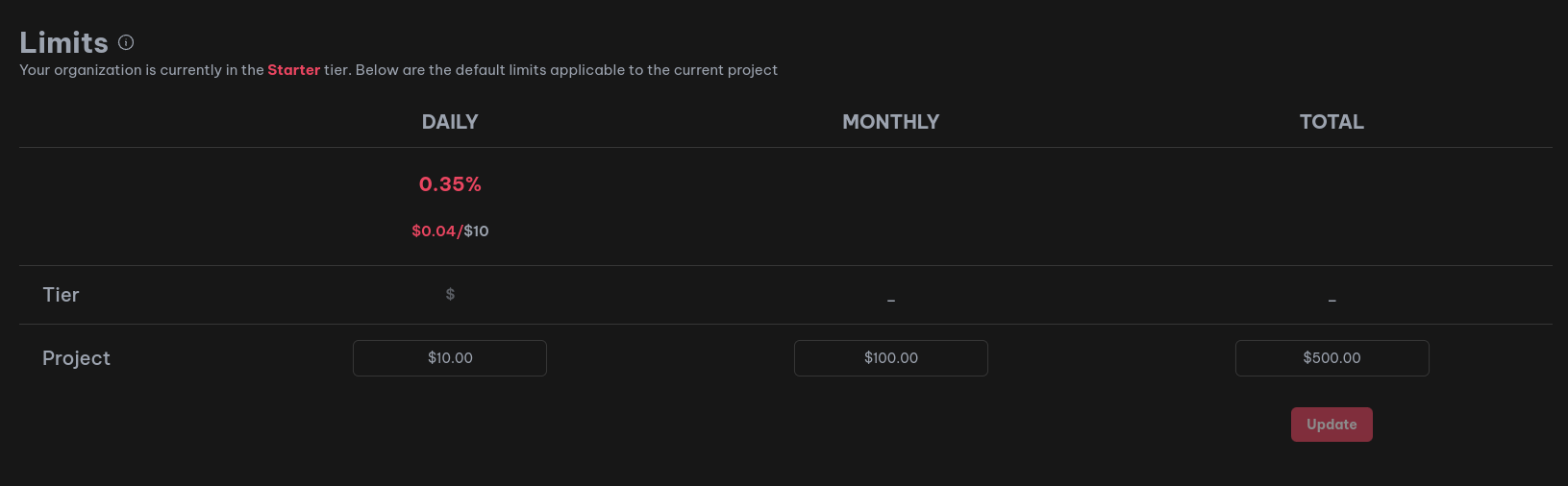 - Daily Limits: Maximum usage per day, e.g., $10 in the Starter Tier.