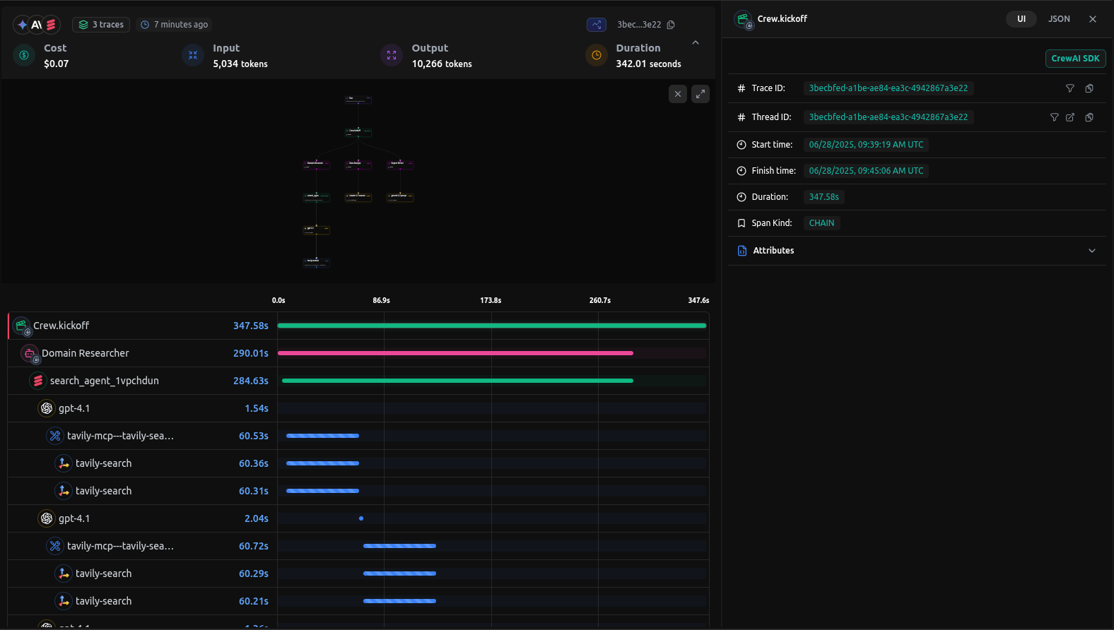 All CrewAI calls—agent initialization, task execution, and model responses—are automatically linked.